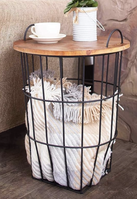 This stylish metal accent table combines a convenient tabletop with a wire basket for easy storage of blankets, toys, and more. Durable and versatile, its sleek metal and wood design fits perfectly in any room—from the living area to the bedroom. A modern, functional piece that adds both style and practicality to your home.