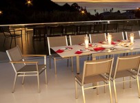 Montego Crystal Fire Pit Coffee Table with Wicker Base by The Outdoor GreatRoom Company is a nice addition to a modern designed backyard of a terrace. the flame height is adjustable. The top is made of tempered glass.