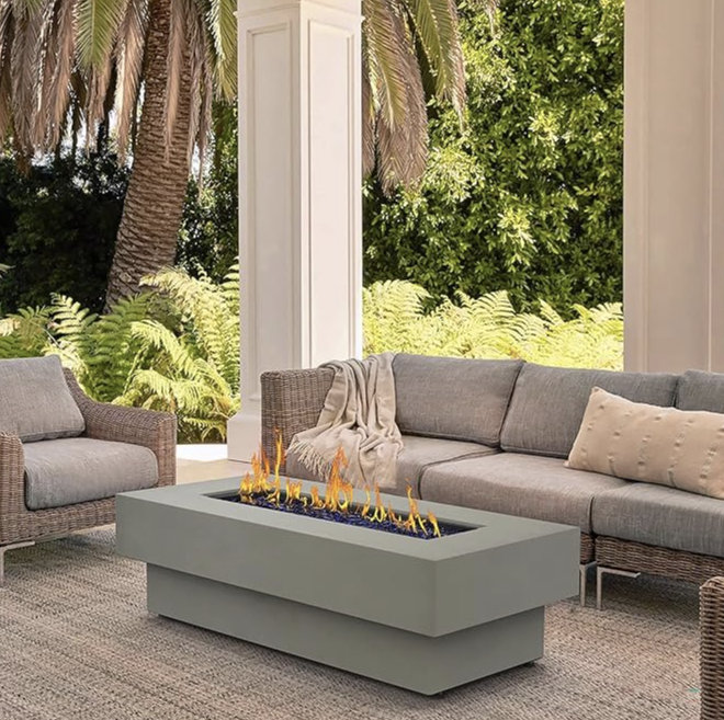 This fire pit coffee table is a beautiful and stylish product that could look great in any outdoor space. It’s available in two colors. Materials that were used for construction are quartz concrete, aluminum.