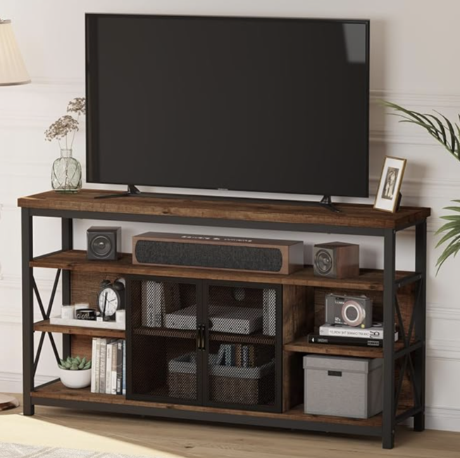 Blending rugged charm with practical features, this 60″ industrial TV stand offers open shelves, a soundbar shelf, and adjustable compartments to neatly store media, books, and electronics. A mesh door cabinet hides clutter, while six rear cord holes keep cables organized. Reinforced with X-frame metal sides and sturdy support tubes, it holds up to 300 lbs on top and 200 lbs per shelf. Made from high-grade MDF and FSC-certified materials, it features a taller design for better viewing and includes floor-protecting pads and an anti-tip kit. Ideal for living rooms, bedrooms, or offices, it assembles in just 40 minutes.