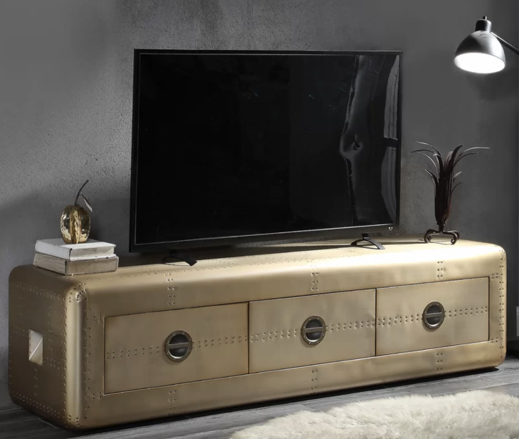 Innes TV Stand by Trent Austin Design is a perfect choice for an industrial living room. This high-quality piece of furniture features a stunning aluminum patchwork with 20th-century riveting details. It features three spacious closed drawers. This TV stand could accommodate 55″ TV size. Assembly is required.